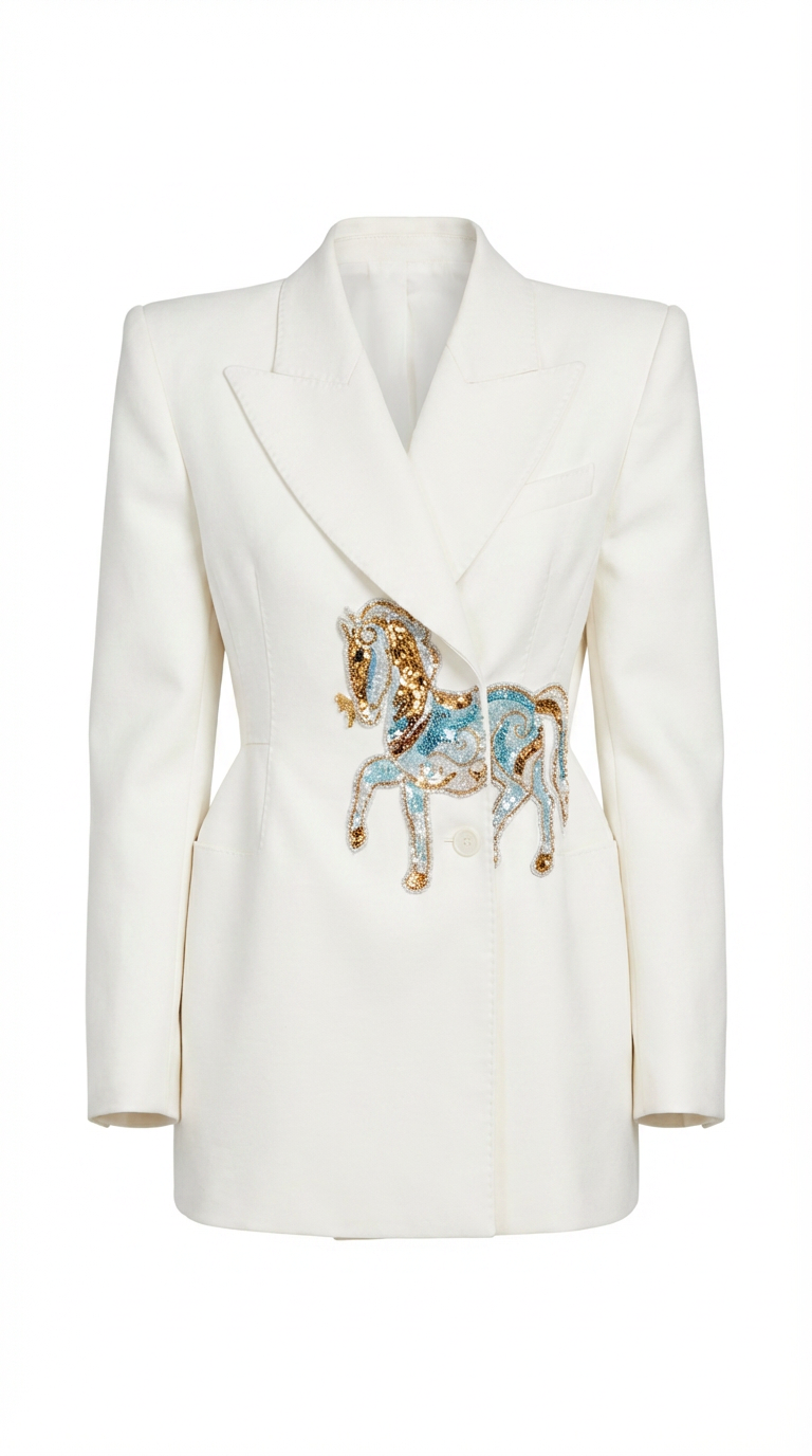 Grace is a hand-tailored dress-suit crafted from organic cotton and cashmere for year-round wear. Finished with recycled organic bamboo buttons and signature embroidery of a winged horse and butterfly, it embodies freedom, strength, and quiet tenderness. Created by skilled artisans, Grace is a piece of conscious luxury made for those who value both beauty and meaning.